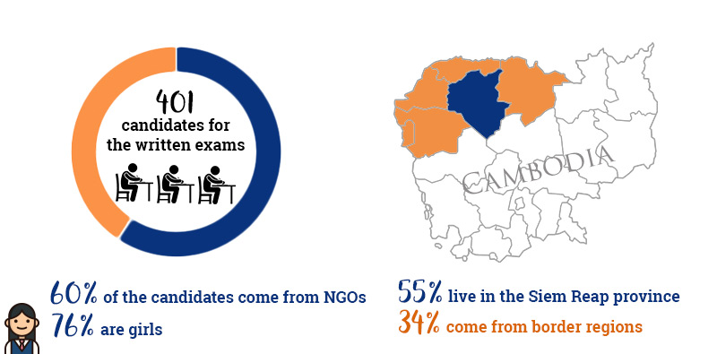 Pour la promotion 2018-2019, 401 dossiers de candidats ont été retenus. Ces derniers ont passé ou passeront des tests écrits en anglais, khmer et mathématiques le 18 mars à Sala Baï et le 25 mars au centre d’Enfants du Mékong de Sisophon, province de Banteay Manchey.