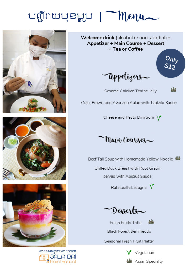 New menu at Sala Baï restaurant for the next two weeks. Come and be part of the students’ training!