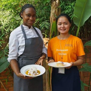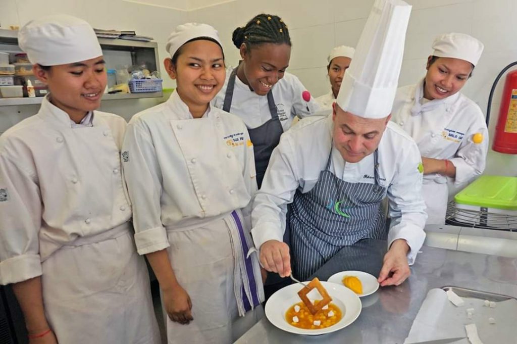 Par conséquent, des missions de mécénat de compétences sont ou seront mises en place pour chaque métier enseigné à Sala Baï. Le Lycée hôtelier de la Rochelle est ainsi partenaire de l’école. Chaque année, trois professeurs de cuisine et de restaurant et trois élèves effectuent une mission de deux semaines à Sala Baï. Apprentissage de nouvelles techniques, utilisation de nouveaux ingrédients, travail sur la mise en place des assiettes, sur la créativité des recettes tant sur le plan gustatif que sur le plan visuel, sont leurs principaux axes de travail. Ces deux semaines de transfert de compétences ont été couronnées par un dîner gastronomique : Great chefs meeet great students ( voir la vidéo de la soirée ). Ces missions du lycée hôtelier de la Rochelle vont se poursuivre et s’enrichir d’échanges. A partir de 2020, au moins deux professeurs de cuisine et de restaurant de Sala Baï iront se former pendant un mois à l’école hôtelière de la Rochelle.