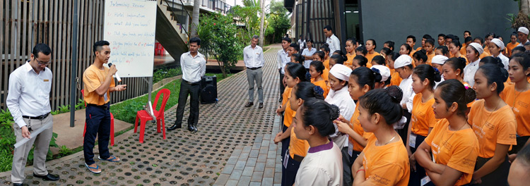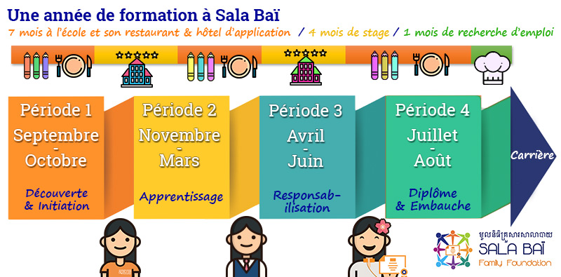 La formation de Sala Baï est un passeport pour l’emploi. Elle permet aux jeunes Cambodgiens de sortir de la pauvreté en intégrant le marché hôtelier en un temps record. Le programme alterne entre cours théoriques et pratique professionnelle, à l’école ou durant les stages effectués dans les hôtels partenaires.