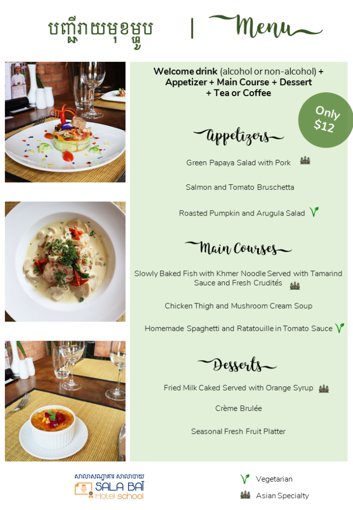 New menu at Sala Baï restaurant for the next two weeks. Come and be part of the students’ training!